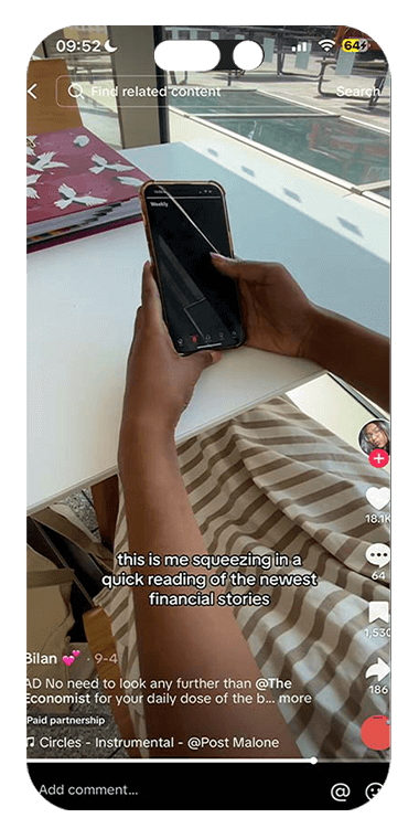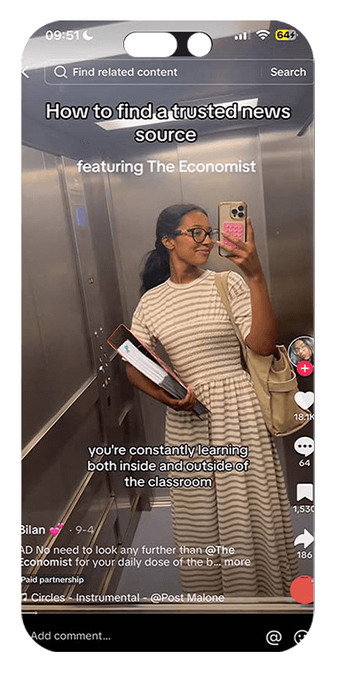 Bilan’s authentic and relatable content seamlessly integrated The Economist into the daily routines of students, from morning reads to study sessions. Her emphasis on the importance of staying informed resonated deeply with her audience, showcasing The Economist as a catalyst for critical thinking and intellectual curiosity. By positioning The Economist as an essential academic ally rather than pushing direct subscriptions, we built lasting trust and engagement, making it the preferred resource for students seeking reliable, in-depth news coverage.