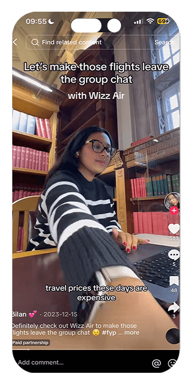 Wizz Air wanted to connect with university students looking for affordable travel options, presenting itself as the ideal choice for spontaneous or planned trips with friends. Collaborating with Bilan, a creator well-versed in student lifestyle content, we tailored a campaign that showcased Wizz Air’s affordable and high-quality flights as accessible for students.